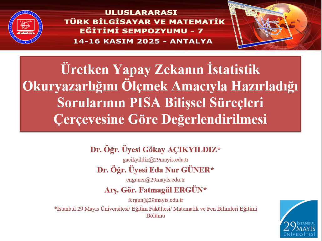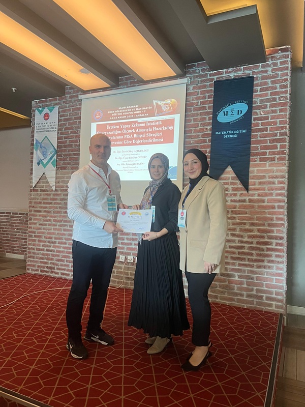14-16 Kasım tarihlerinde Antalya/ Alanya'da gerçekleştirilen 7. TÜRKBİLMAT Sempozyumuna Dr. Öğr. Üyesi Gökay AÇIKYILDIZ, Dr. Öğr. Üyesi Eda Nur GÜNER ve Arş. Gör. Fatmagül ERGÜN “Evaluation of Generative Artificial Intelligence's Questions Prepared to Measure Statistical Literacy According to PISA Cognitive Processes Framework (Üretken Yapay Zekanın İstatistik Okuryazarlığını Ölçmek Amacıyla Hazırladığı Sorularının PISA Bilişsel Süreçleri Çerçevesine Göre Değerlendirilmesi)“ başlıklı bildirilerini başarı ve yüksek katılımla sundular.